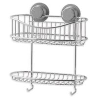 - Shower Caddies– Find one that works for your shower. My new favorite is one with knobs that make the suction cups actually stick. It’s worth the extra money. Our stuff stays put on the road. It’s no fun cleaning up shampoo goo out of the shower! In our first trailer, there was no place to put a shower caddy, and we had a plastic basket with a handle. It was full of shampoo, body wash, etc. It lived in the shower when we were parked but was put away in the cupboard when we were on the road. If you use this method, be sure to dry it out before you put it in the cupboard, or you could end up with a whole new mess. See photo below of my new favorite shower caddy from Bed Bath and Beyond.