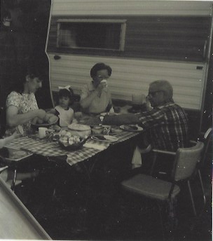Feature Photo note: This photo was taken in our backyard at a barbecue with my grandparents. The kid with the big bow in her hair is me. That was our trailer when I was a little kid. My brother and I figured out that it had been about 45 years since we camped together in a trailer by the time of the Glacier trip in this blog. My parents sold it and we were tent campers after that … until we had kids of our own….
